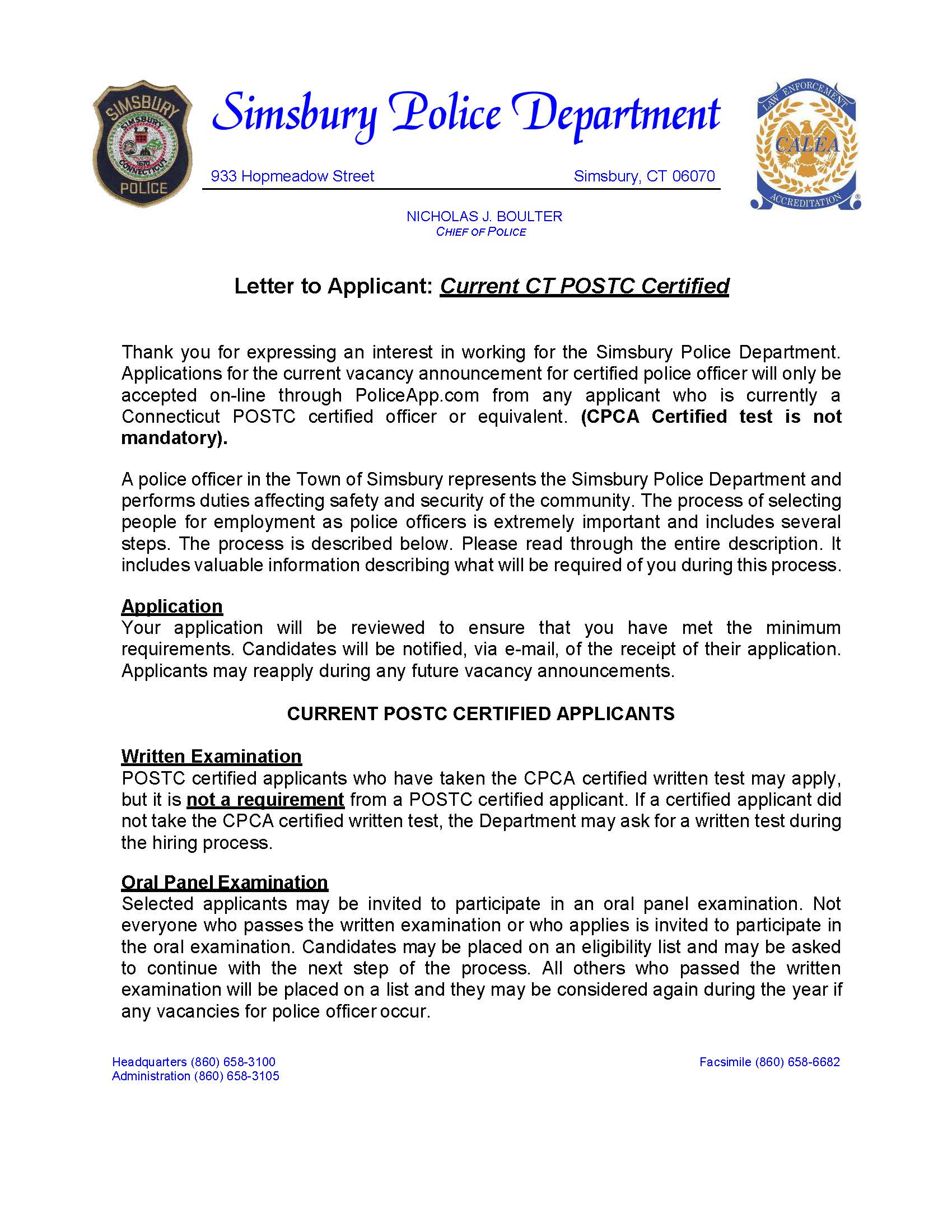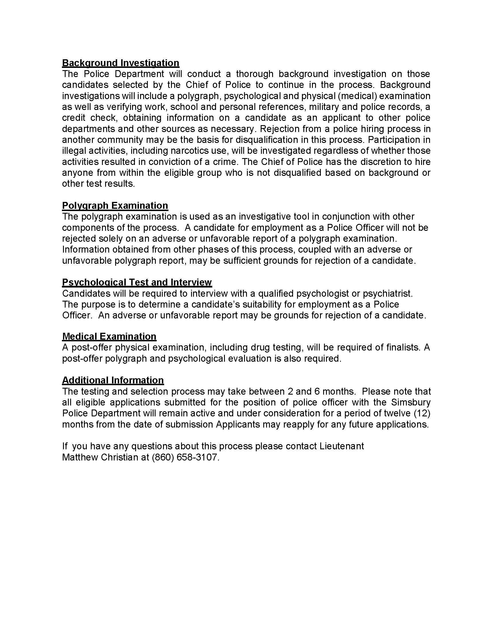 - Testing will include a written exam, oral exam, extensive background investigation, psychological exam, polygraph exam, a medical exam and a controlled substance screen. Please read the Letter to Certified Applicant document entirely before applying. Applications will only be accepted online at www.PoliceApp.com/Simsbury.